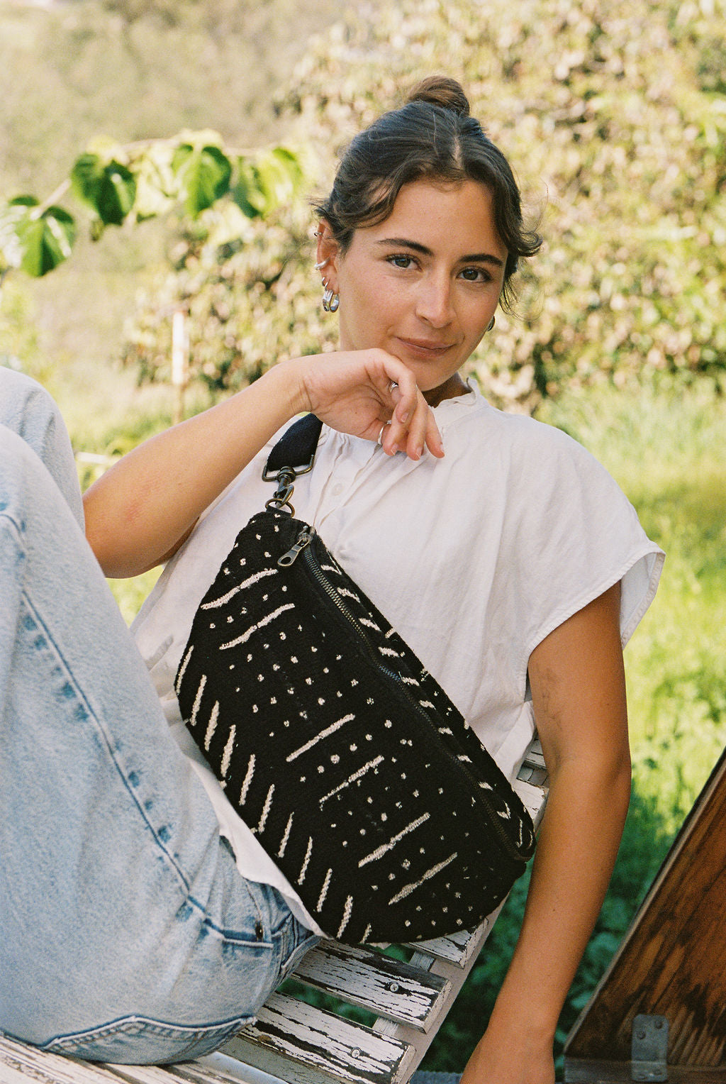 daily essentials and hands free. As with all of our products, it’s created to accompany you on all of your adventures and is perfect for travel. It's handmade with traditional African mud cloth and fully lined with natural canvas and two internal pockets for your essentials. It includes an adjustable, detachable cotton strap and a premium zipper guaranteed never to stick.
